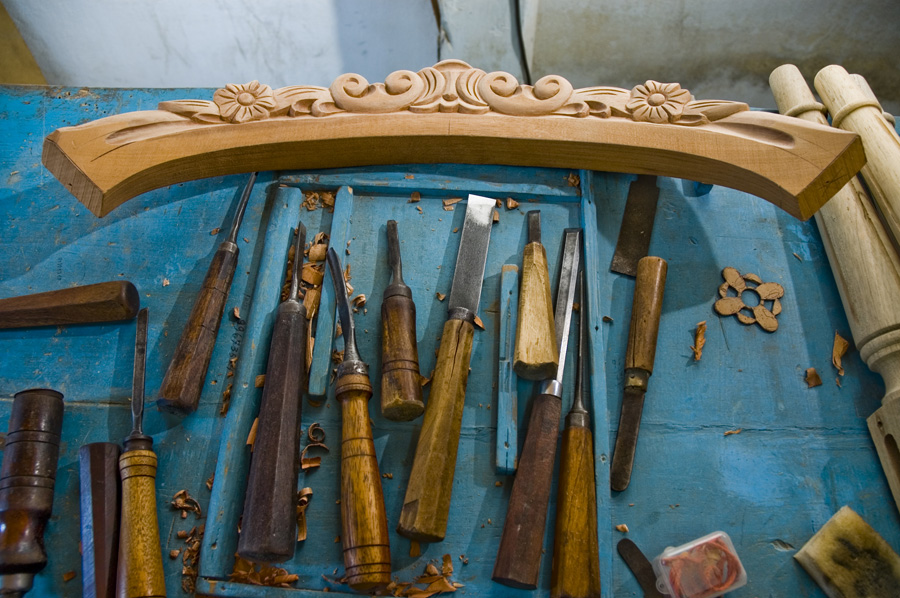 Apesar de toda a beleza do entalhe, o processo de confecção das peças está longe de ser fácil. São horas de inspiração e muito tempo de trabalho, que começa já na escolha da madeira. “As madeiras mais usadas são as macias, isto é, as que podem ser cortadas com mais facilidade. Mas também é possível usar madeiras rijas (duras). A desvantagem destas, porém, é que por serem muito rígidas, elas dificultam a confecção de detalhes e tornam o serviço mais demorado”, explica Hales.