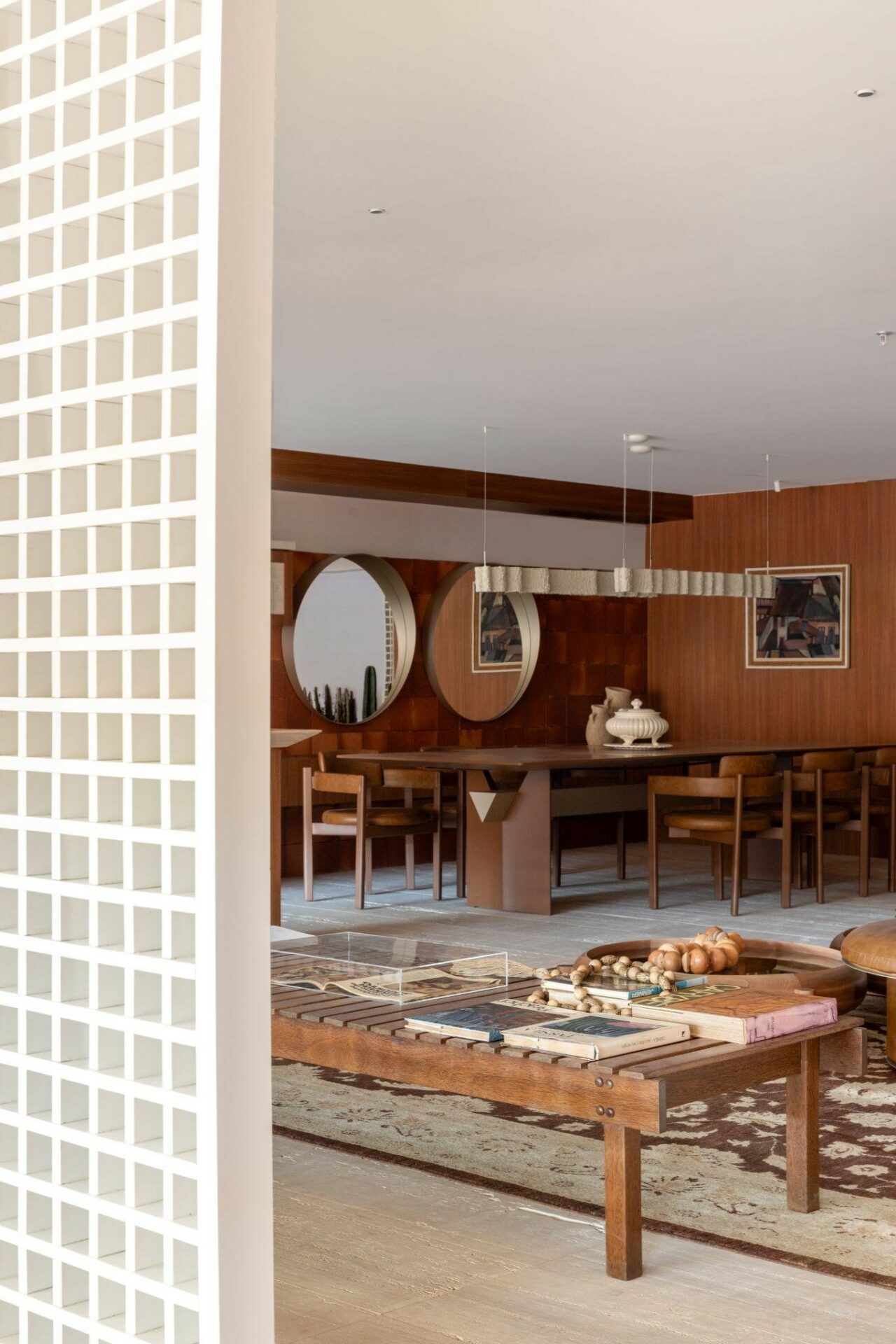 A memória de família da arquiteta Mariana Leal, do escritório Morada 3112, é revisitada por meio da homenagem ao seu tio-avô, o artista sergipano radicado na Bahia, Jenner Augusto. Se estivesse vivo, ele completaria 100 anos em 2024. No estar e jantar, as obras do artista estão espalhadas por todo o ambiente.