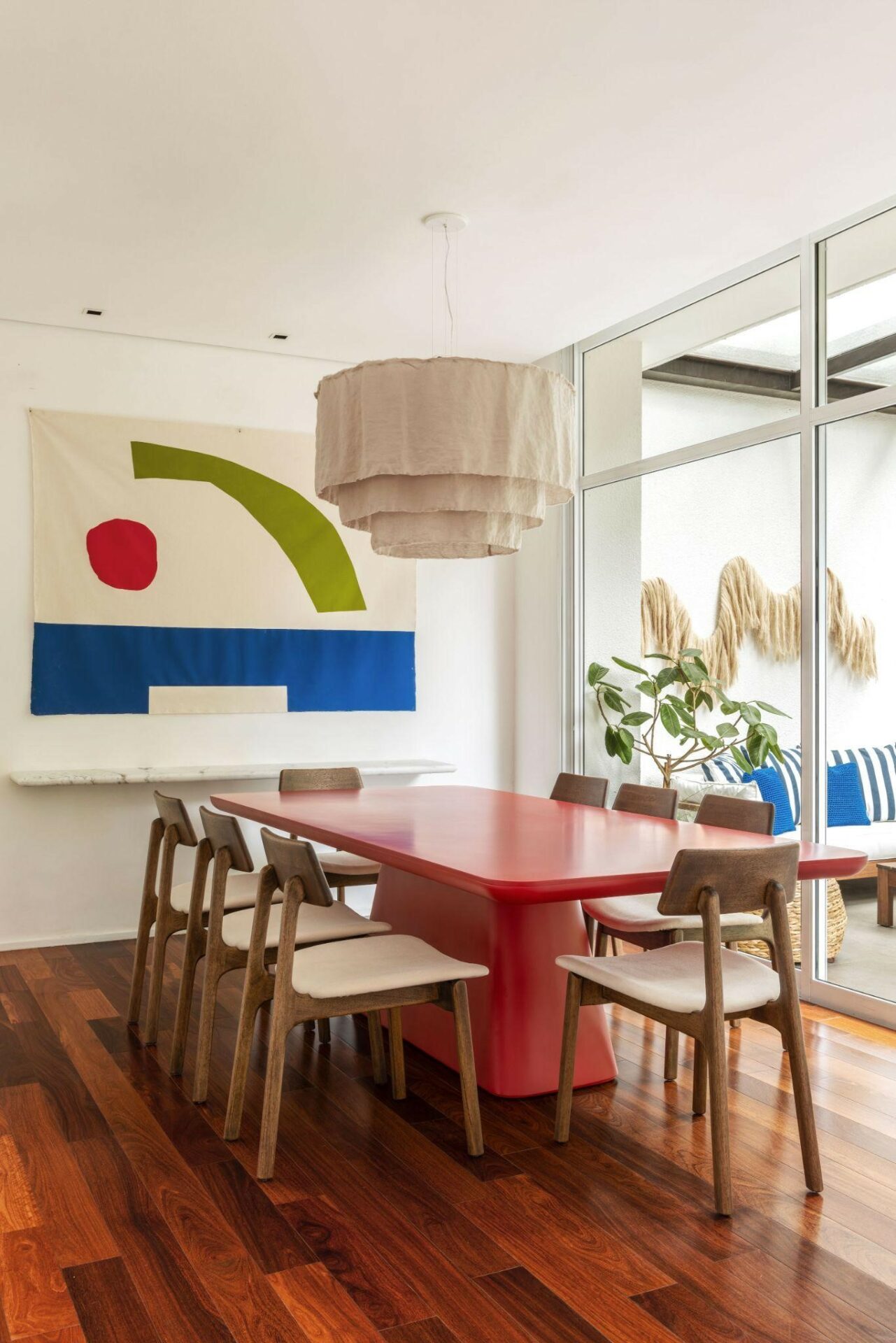 Mesa de jantar colorida, cadeiras neutras