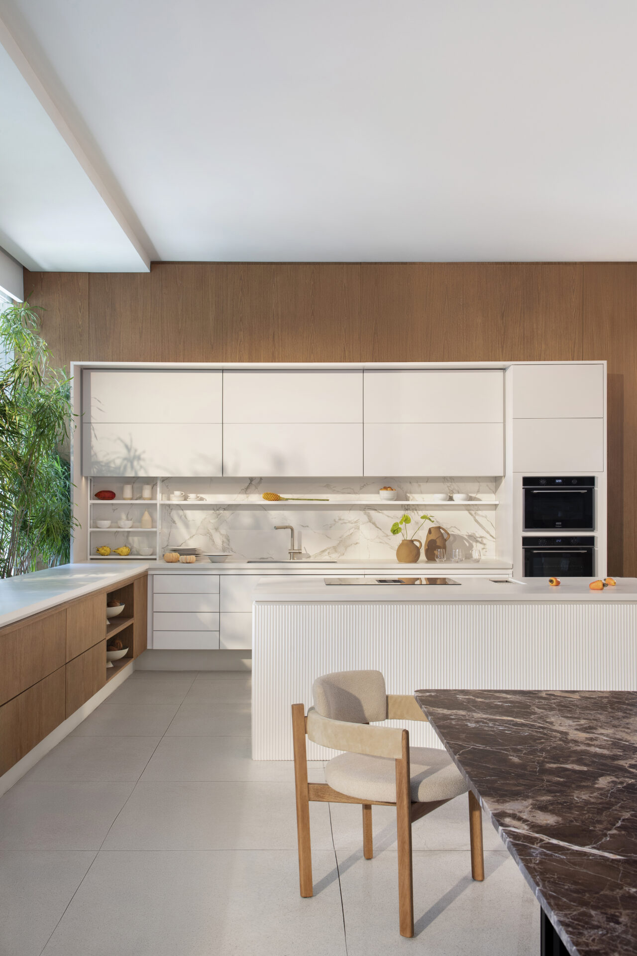 Armário acima dos fornos em lâmina de madeira freijó lavado. Armário aéreo com sistema articulador com acionamento automatizado servo-drive da Blum. Forno elétrico, forno de micro-ondas e máquina de café embutidos.