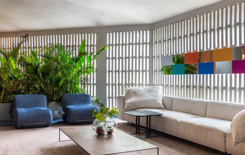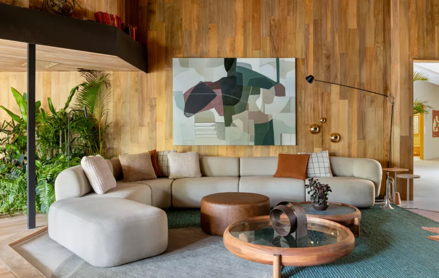 O Lounge Encontros é um ambiente convidativo, com disposição do mobiliário flexível e adaptável a diferentes usos.