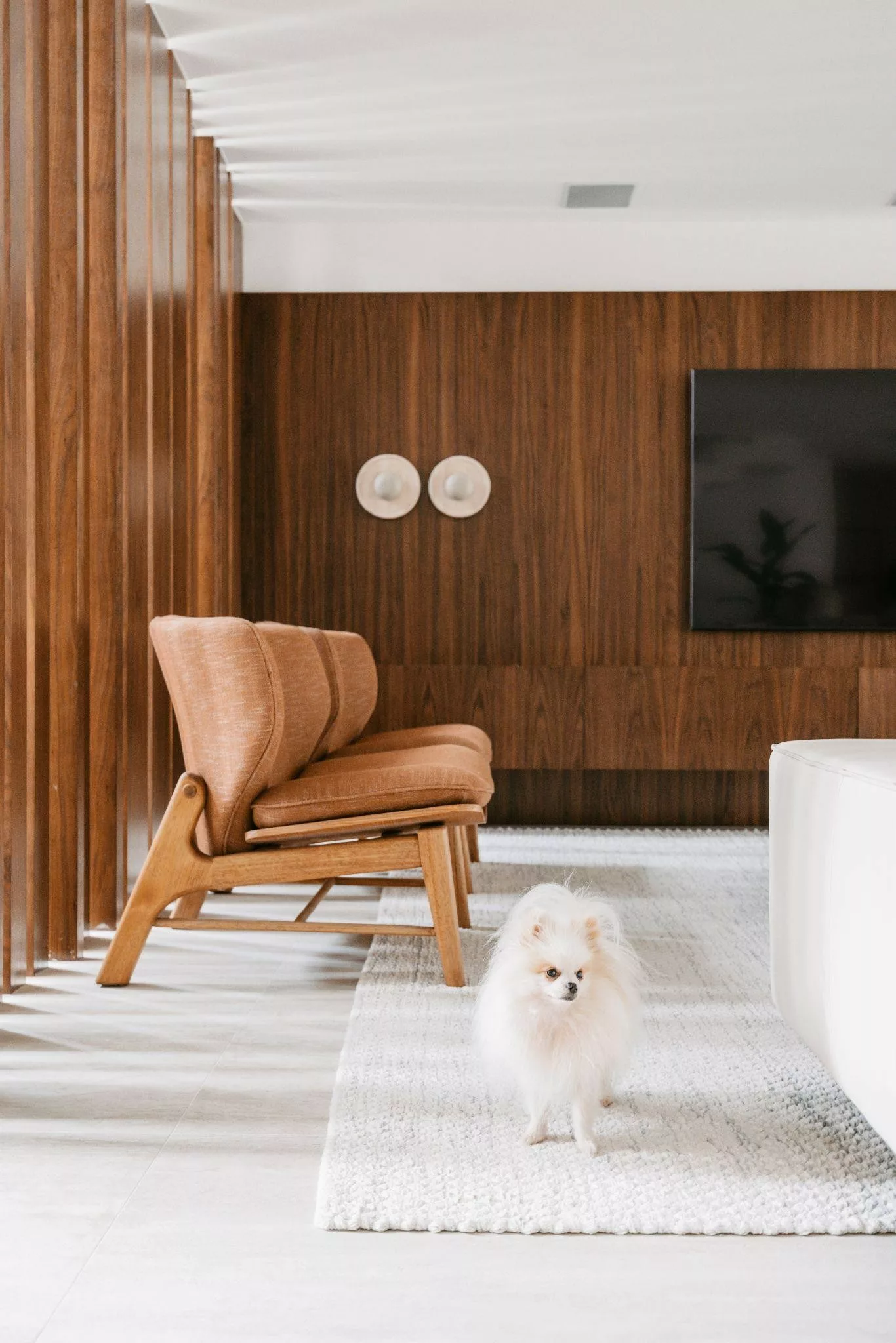 Nesta sala de estar projetada por Ar Contemporâneo, as poltronas Benício assumem a função de apoio para sala de estar e de TV.
