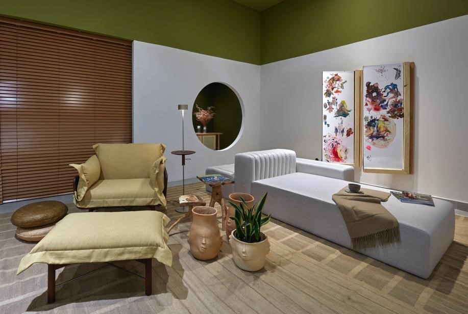 O protagonismo das janelas durante a pandemia inspira o espaço, que nos leva a refletir sobre o que está dentro e fora de nós.  O banco Órbita de Isabela Vecci, peça central do ambiente, tem mesa de apoio acoplada em sua estrutura, sintetizando a pluralidade presente no novo morar.