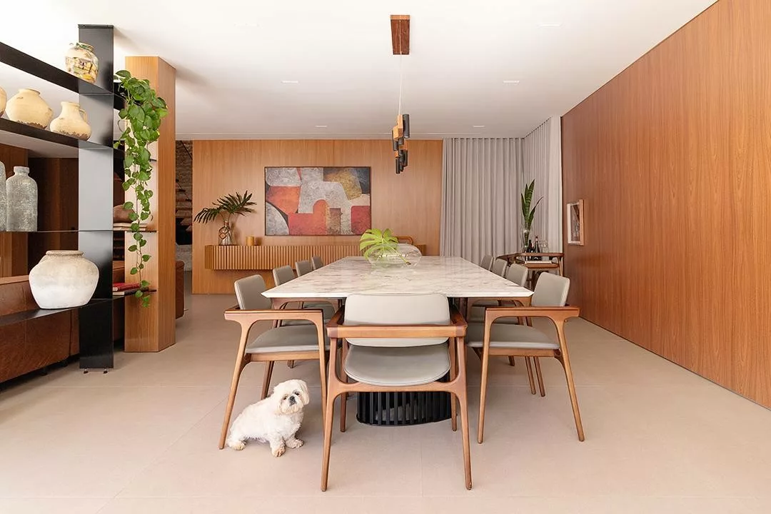Na sala de jantar de Raphael Ticiano, ela garante o conforto de quem se senta à mesa da sala de jantar.